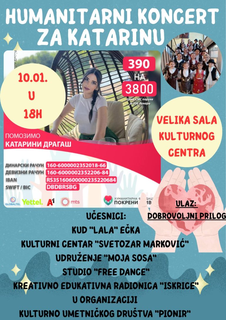 U subotu, 10. januara 2026. sa početkom u 18 časova u Kulturnom centru Zrenjanina u organizaciji Kulturno-umetničkog društva GIK “Banat – Pionir” održaće se humanitarni koncert. U programu učestvuju anasambli KUD “Lala” iz Ečke, Kulturnog centra „Svetozar Marković“, udruženja “Moja sosa”, plesni studio “Free Dance” i Kreativna radionica “Iskrice”. Ulaz je na bazi dobrovoljnog priloga i namenjen je lečenju Katarine Dragaš.