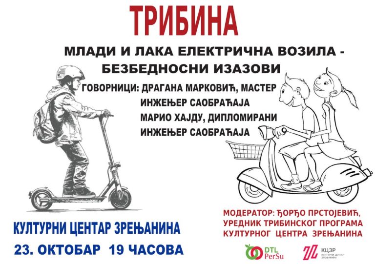 Tribina o bezbednosnim izazovima kod korišćenja lakih električnih vozila (bicikl, trotinet) kod mlađe populacije. Saobraćajni propisi, zakonska regulativa kao i primeri korišćenja lakih električnih vozila u praksi i svakodnevnom životu u našem gradu su tema tribine na kojoj će govoriti profesori saobraćajne grupe predmeta u zrenjaninskoj Tehničkoj školi, saobraćajni inženjeri Mario Hajdu i Dragana Marković.